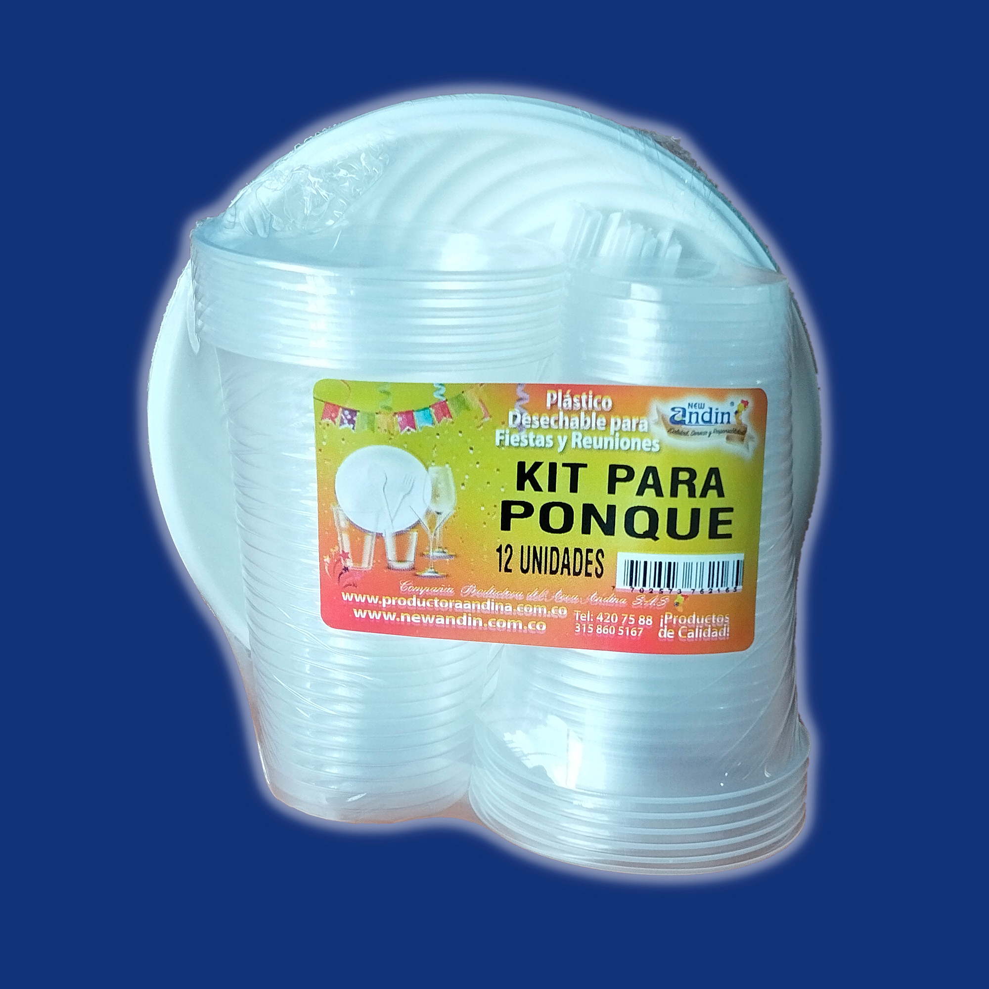 Kit de plato pequeño desechable, vaso plástico transparente y tenedor blanco pequeño, para servir ponqué o tortas. Ideal para fiestas, reuniones o eventos.